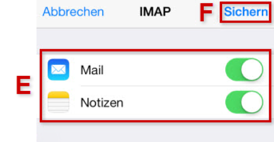 Wählen Sie aus, welche Daten (Mail, Notizen) Sie synchronisieren möchten (E) und bestätigen Sie mit Sichern (F). Fertig!