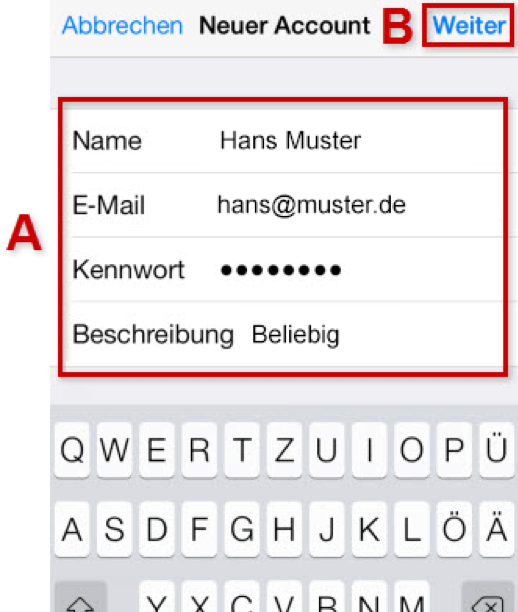 Tragen Sie nun Ihre Kontodaten ein (A) und tippen Sie danach auf Weiter (B).