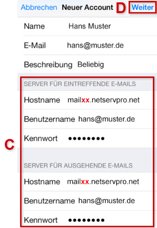 Geben Sie die weiteren Einstellungen ein (C) und fahren Sie anschließend mit Weiter (D) fort.